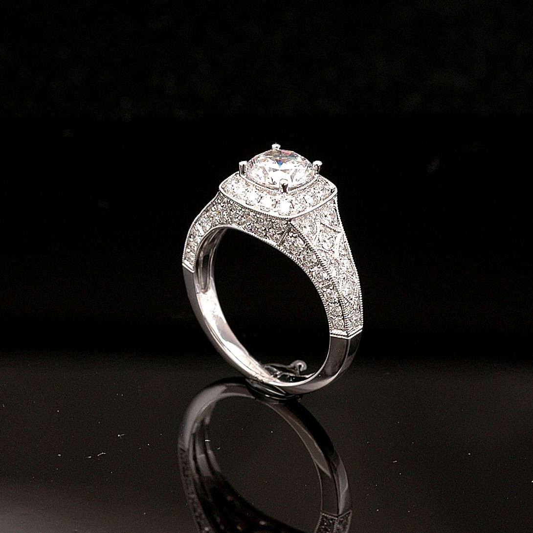 This setting is stunning from every angle! The round is set in a cushion halo, and the smaller diamonds are micropave' set throughout the setting.